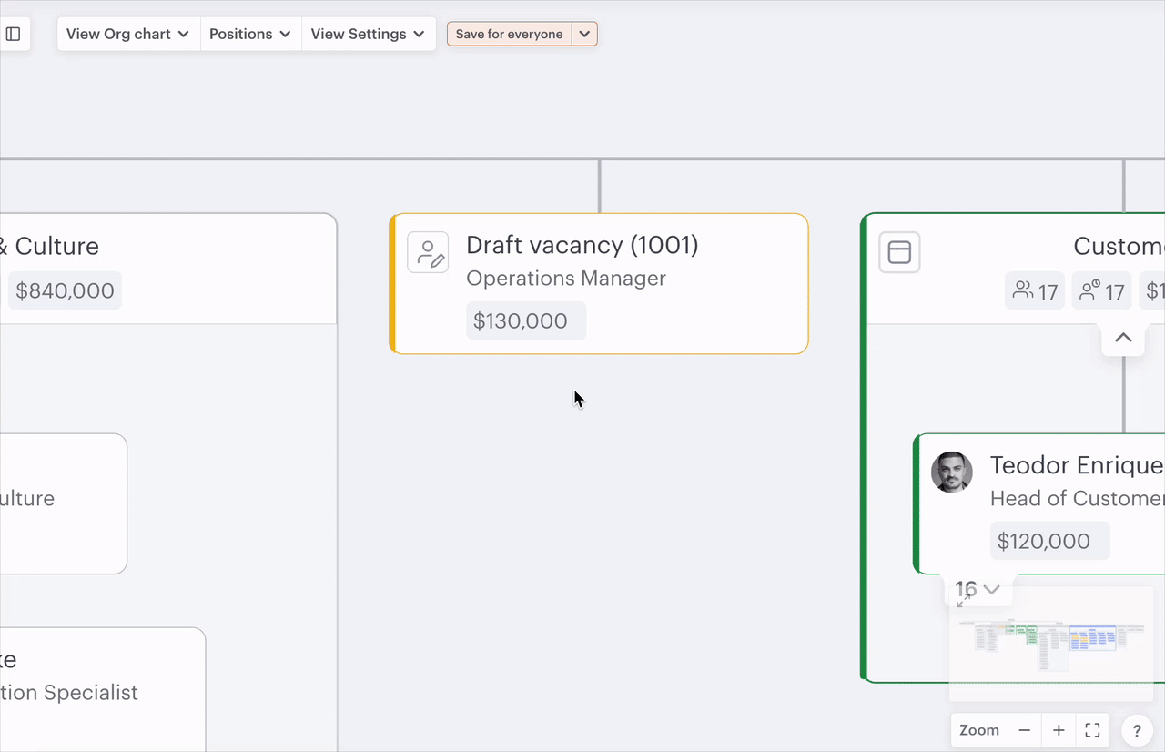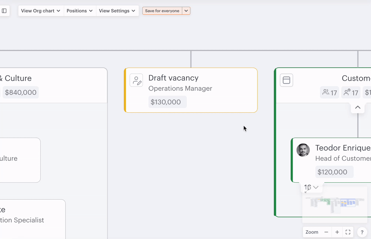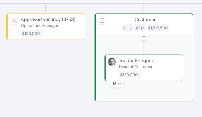 To get a visual understanding of where a new position is going to fit in your organization you can add vacancies using the org chart or if you need to easily add important data such as compensation, effort, start, or end date, in one place, you can use the people & positions table.