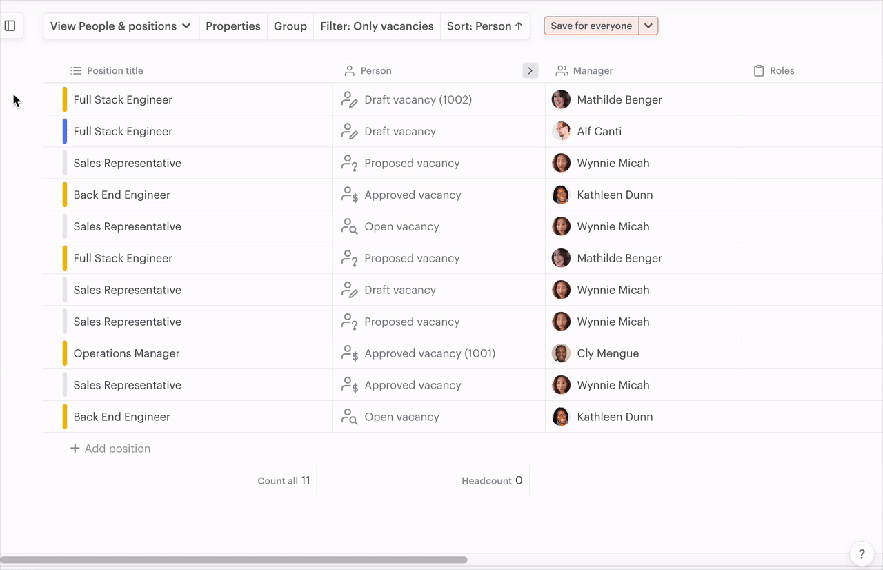 Once you have added all relevant data you can filter the people & positions table to group and order your vacant positions as you want to see that information. For instance, you can filter "only vacancies" to exclude all occupied positions, group by "vacancy status" to see which are at the most advanced stage in the process, and order by start date to get an idea of a timeline.